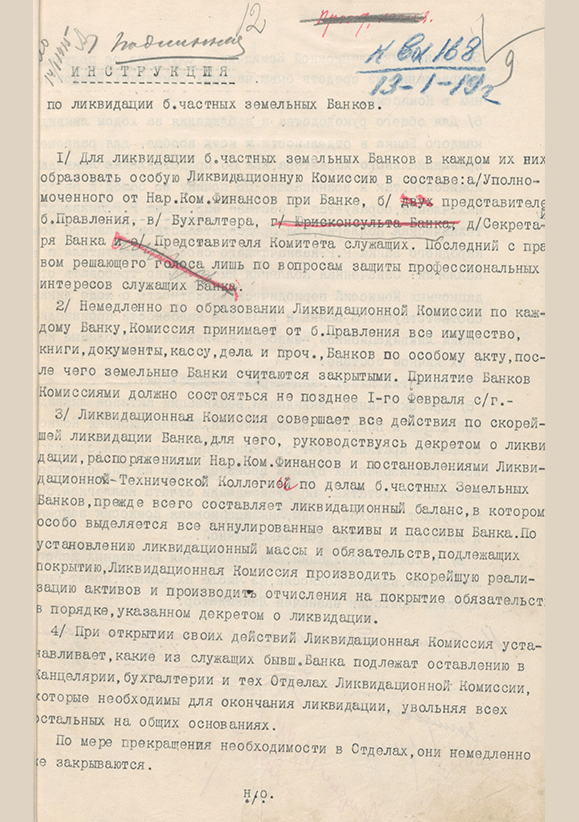 Проект Инструкции о ликвидации б. частных земельных банков. 13 января 1919 г.. — 2 с.. — . РГАЭ, Ф. 2324 . Oп. 25. Д. 63.