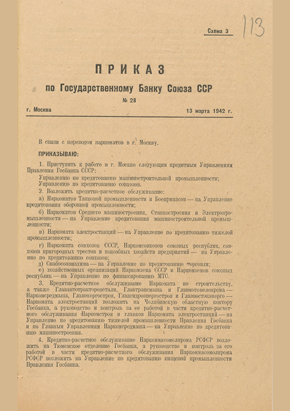 Приказ № 28 по Госбанку СССР от 13 марта 1942 г. О переводе наркоматов в г. Москву. Приказ, проект приказа. — 4 с.. — . РГАЭ, Ф. 2324 . Oп. 26. Д. 2966.