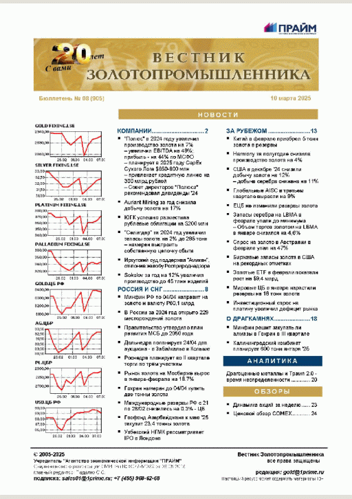 Вестник золотопромышленника : бюллетень. — Москва : ПРАЙМ , 2025, N 8. — 2025.