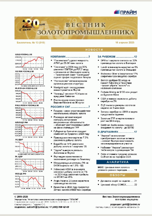 Вестник золотопромышленника : бюллетень. — Москва : ПРАЙМ , 2025, N 13. — 2025.