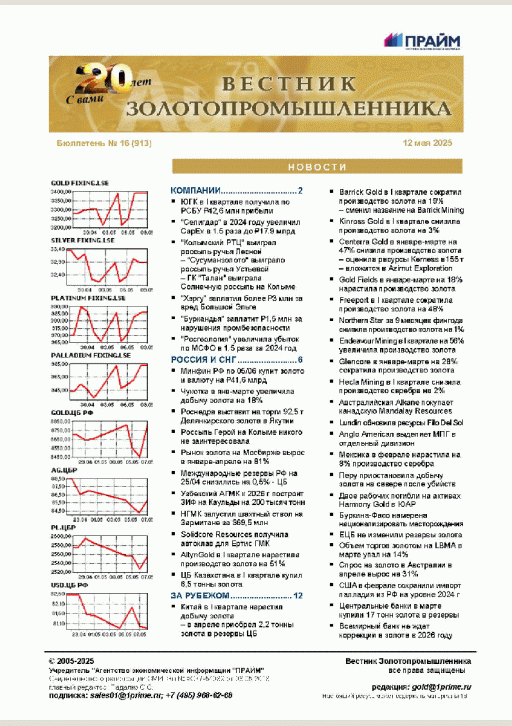 Вестник золотопромышленника : бюллетень. — Москва : ПРАЙМ , 2025, N 16. — 2025.