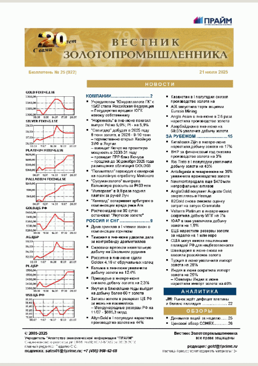 Вестник золотопромышленника : бюллетень. — Москва : ПРАЙМ , 2025, N 25. — 2025.
