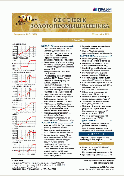 Вестник золотопромышленника : бюллетень. — Москва : ПРАЙМ , 2025, N 32. — 2025.
