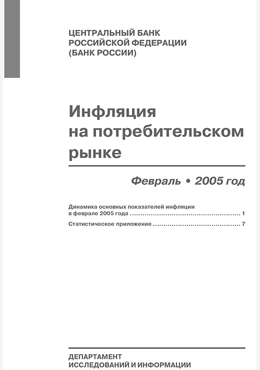Инфляция на потребительском рынке : информационный бюллетень / Центральный банк Российской Федерации, Департамент денежно-кредитной политики. — Москва : Банк России , 2005, N февр.. — 2005.