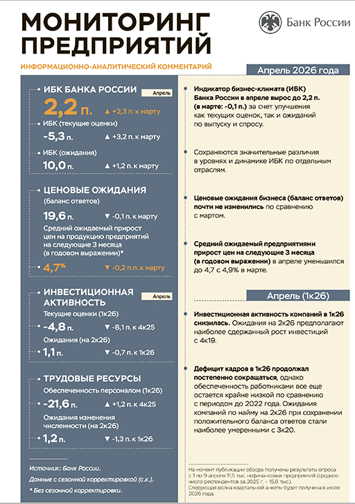 Мониторинг предприятий : информационно-аналитический комментарий / Центральный банк Российской Федерации, Департамент денежно-кредитной политики. — Москва : Банк России , 2026, N апр.. — 2026.
