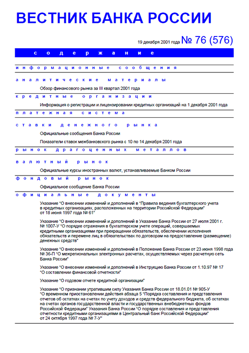 Вестник Банка России / Центральный банк Российской Федерации. — Москва : ПРАЙМ , 2001, N 76. — Москва : ПРАЙМ-ТАСС, 2001.