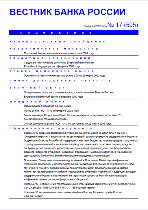 Вестник Банка России / Центральный банк Российской Федерации. — Москва : ПРАЙМ , 2002, N 17. — Москва : ПРАЙМ-ТАСС, 2002.