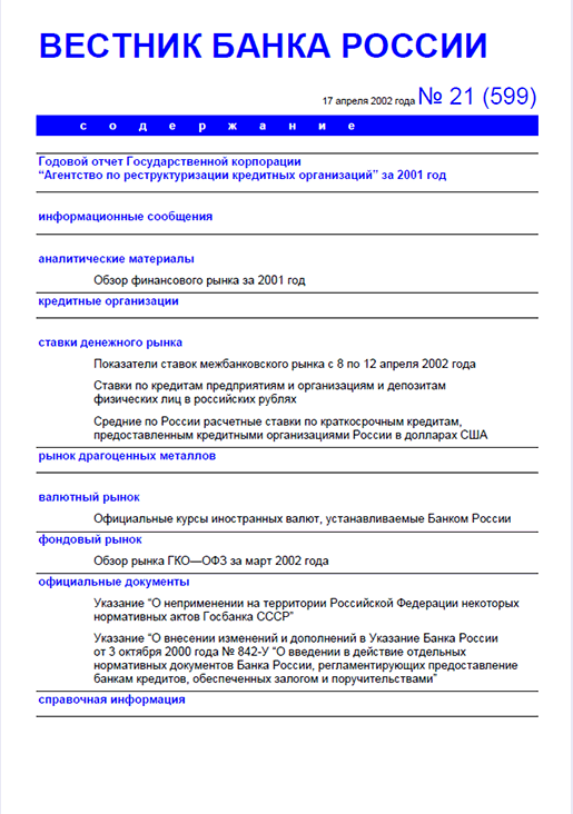 Вестник Банка России / Центральный банк Российской Федерации. — Москва : ПРАЙМ , 2002, N 21. — Москва : ПРАЙМ-ТАСС, 2002.