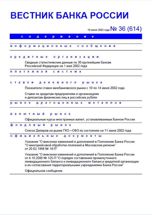 Вестник Банка России / Центральный банк Российской Федерации. — Москва : ПРАЙМ , 2002, N 36. — Москва : ПРАЙМ-ТАСС, 2002.