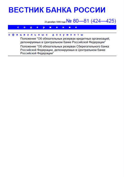 Вестник Банка России / Центральный банк Российской Федерации. — Москва : ПРАЙМ , 1999, N 80/81. — Москва : ИТАР-ТАСС, 1999.