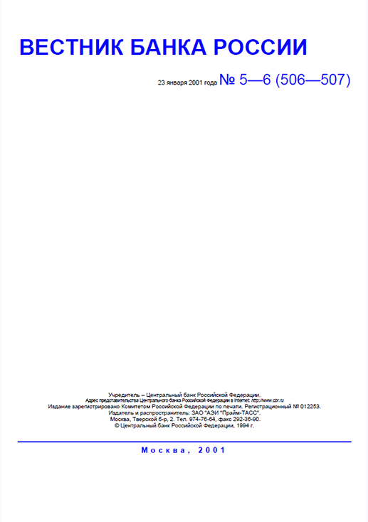 Вестник Банка России / Центральный банк Российской Федерации. — Москва : ПРАЙМ , 2001, N 5/6. — Москва : ПРАЙМ-ТАСС, 2001.