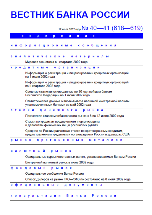 Вестник Банка России / Центральный банк Российской Федерации. — Москва : ПРАЙМ , 2002, N 40/41. — Москва : ПРАЙМ-ТАСС, 2002.