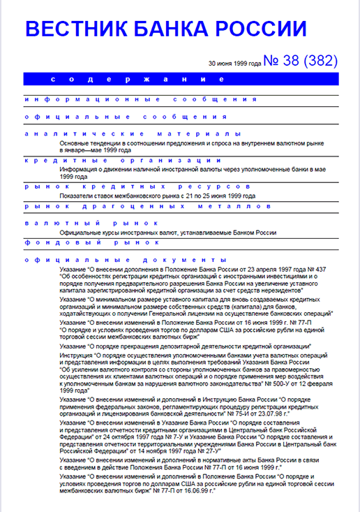 Вестник Банка России / Центральный банк Российской Федерации. — Москва : ПРАЙМ , 1999, N 38. — Москва : ИТАР-ТАСС, 1999.