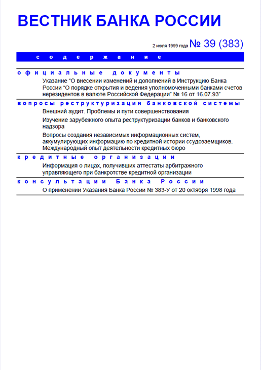 Вестник Банка России / Центральный банк Российской Федерации. — Москва : ПРАЙМ , 1999, N 39. — Москва : ИТАР-ТАСС, 1999.