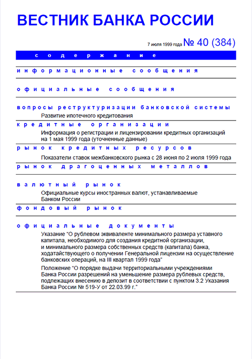 Вестник Банка России / Центральный банк Российской Федерации. — Москва : ПРАЙМ , 1999, N 40. — Москва : ИТАР-ТАСС, 1999.