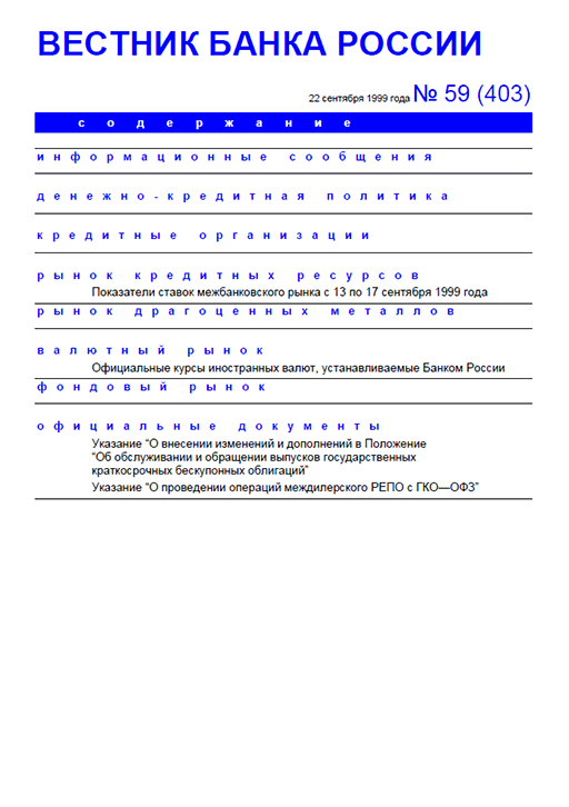 Вестник Банка России / Центральный банк Российской Федерации. — Москва : ПРАЙМ , 1999, N 59. — Москва : ИТАР-ТАСС, 1999.
