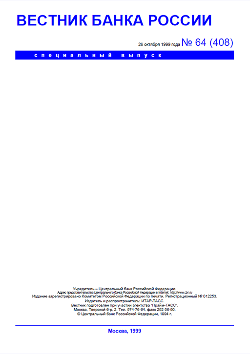 Вестник Банка России / Центральный банк Российской Федерации. — Москва : ПРАЙМ , 1999, N 64. — Москва : ИТАР-ТАСС, 1999.
