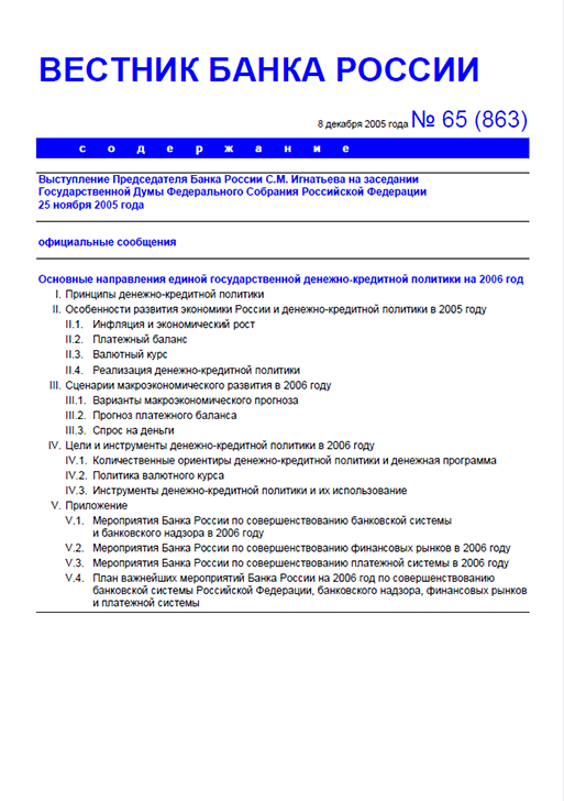 Вестник Банка России / Центральный банк Российской Федерации. — Москва : ПРАЙМ , 2005, N 65. — Москва : ПРАЙМ-ТАСС, 2005.
