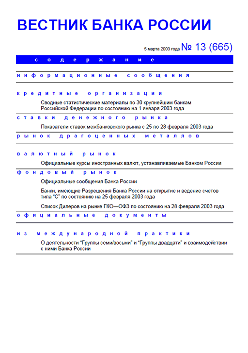 Вестник Банка России / Центральный банк Российской Федерации. — Москва : ПРАЙМ , 2003, N 13. — Москва : ПРАЙМ-ТАСС, 2003.