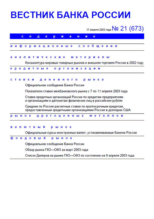 Вестник Банка России / Центральный банк Российской Федерации. — Москва : ПРАЙМ , 2003, N 21. — Москва : ПРАЙМ-ТАСС, 2003.