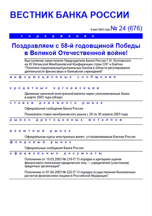 Вестник Банка России / Центральный банк Российской Федерации. — Москва : ПРАЙМ , 2003, N 24. — Москва : ПРАЙМ-ТАСС, 2003.