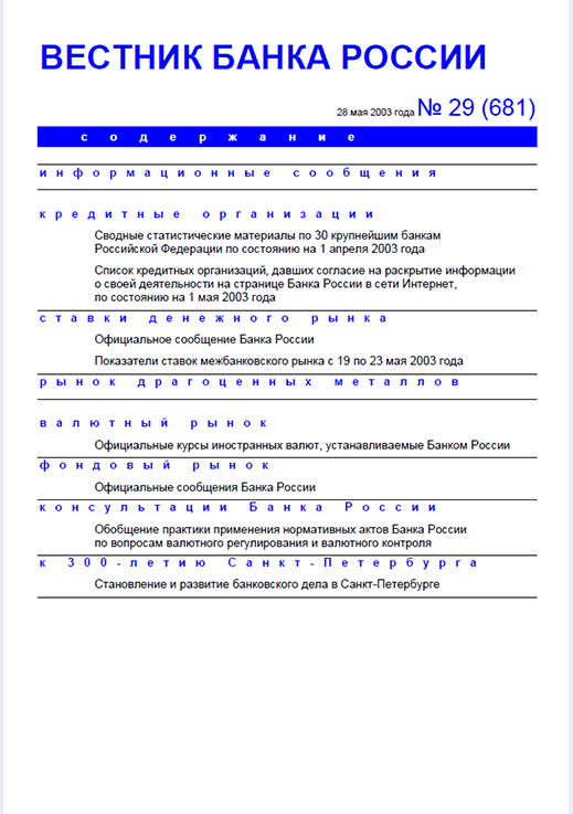 Вестник Банка России / Центральный банк Российской Федерации. — Москва : ПРАЙМ , 2003, N 29. — Москва : ПРАЙМ-ТАСС, 2003.