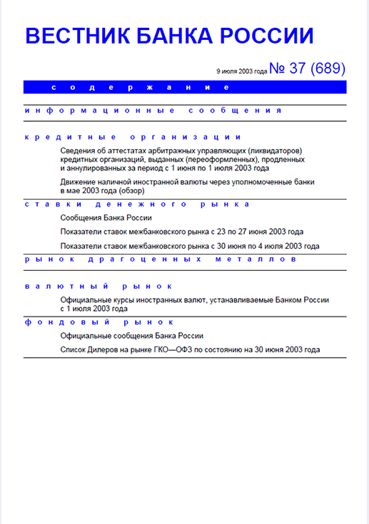 Вестник Банка России / Центральный банк Российской Федерации. — Москва : ПРАЙМ , 2003, N 37. — Москва : ПРАЙМ-ТАСС, 2003.
