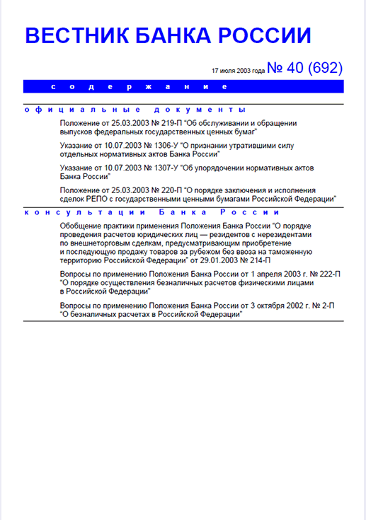 Вестник Банка России / Центральный банк Российской Федерации. — Москва : ПРАЙМ , 2003, N 40. — Москва : ПРАЙМ-ТАСС, 2003.