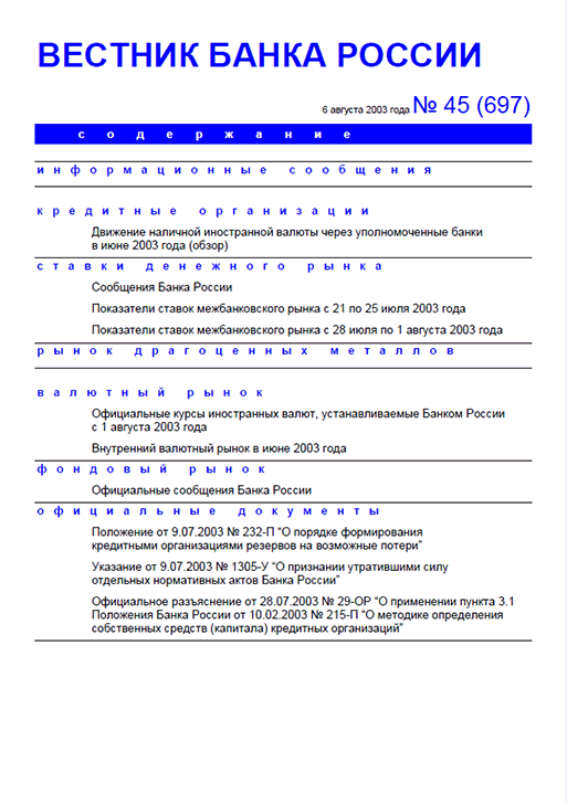Вестник Банка России / Центральный банк Российской Федерации. — Москва : ПРАЙМ , 2003, N 45. — Москва : ПРАЙМ-ТАСС, 2003.