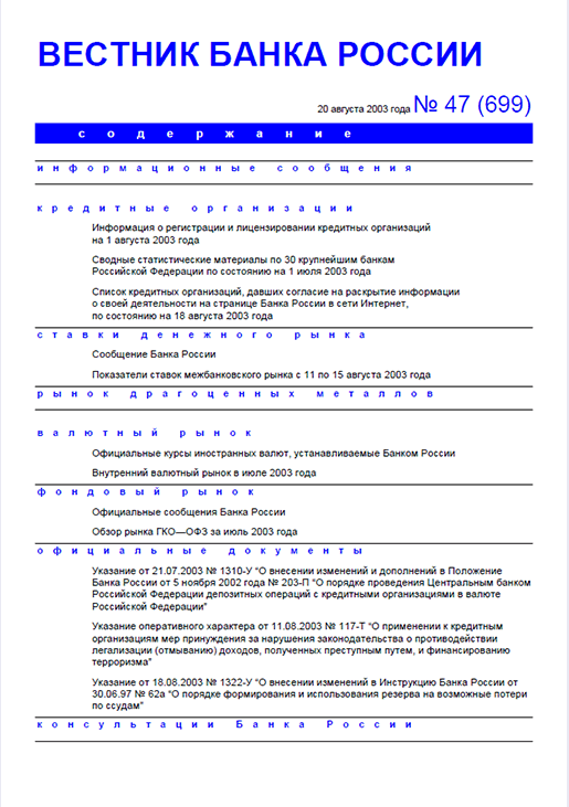 Вестник Банка России / Центральный банк Российской Федерации. — Москва : ПРАЙМ , 2003, N 47. — Москва : ПРАЙМ-ТАСС, 2003.