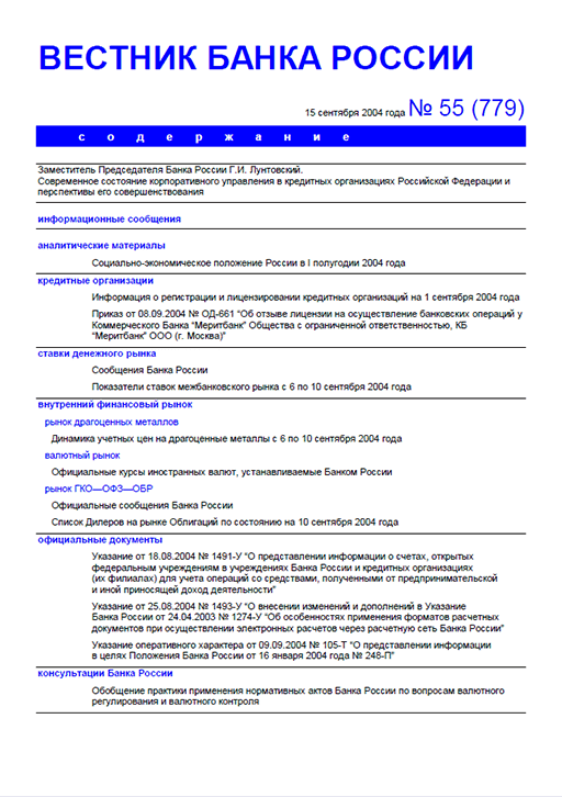 Вестник Банка России / Центральный банк Российской Федерации. — Москва : ПРАЙМ , 2004, N 55. — Москва : ПРАЙМ-ТАСС, 2004.
