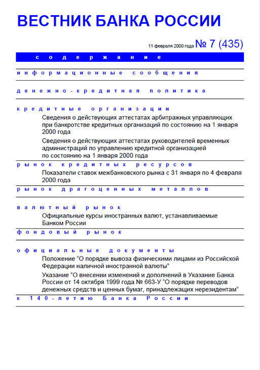 Вестник Банка России / Центральный банк Российской Федерации. — Москва : ПРАЙМ , 2000, N 7. — Москва : ИТАР-ТАСС, 2000.