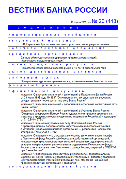 Вестник Банка России / Центральный банк Российской Федерации. — Москва : ПРАЙМ , 2000, N 20. — Москва : ИТАР-ТАСС, 2000.