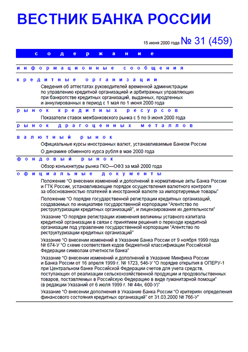 Вестник Банка России / Центральный банк Российской Федерации. — Москва : ПРАЙМ , 2000, N 31. — Москва : ИТАР-ТАСС, 2000.
