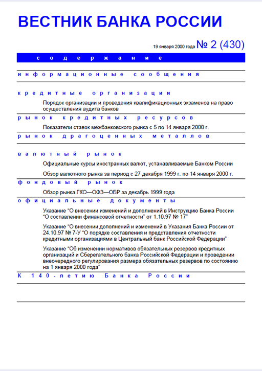 Вестник Банка России / Центральный банк Российской Федерации. — Москва : ПРАЙМ , 2000, N 2. — Москва : ИТАР-ТАСС, 2000.