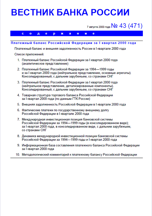 Вестник Банка России / Центральный банк Российской Федерации. — Москва : ПРАЙМ , 2000, N 43. — Москва : ИТАР-ТАСС, 2000.