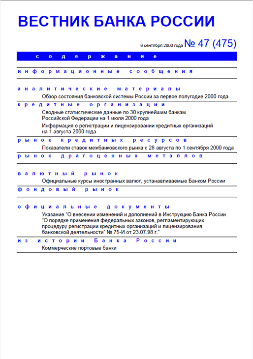 Вестник Банка России / Центральный банк Российской Федерации. — Москва : ПРАЙМ , 2000, N 47. — Москва : ИТАР-ТАСС, 2000.
