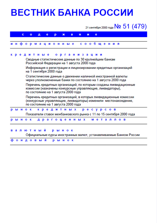 Вестник Банка России / Центральный банк Российской Федерации. — Москва : ПРАЙМ , 2000, N 51. — Москва : ИТАР-ТАСС, 2000.