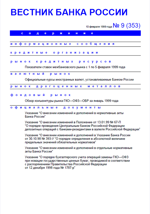 Вестник Банка России / Центральный банк Российской Федерации. — Москва : ПРАЙМ , 1999, N 9. — Москва : ИТАР-ТАСС, 1999.