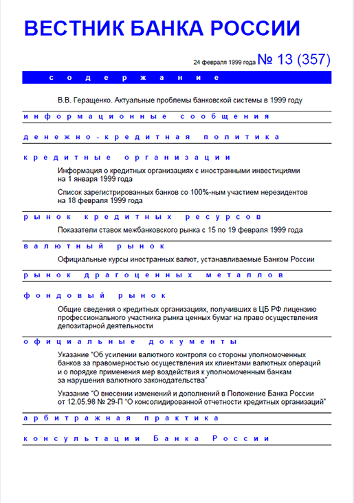 Вестник Банка России / Центральный банк Российской Федерации. — Москва : ПРАЙМ , 1999, N 13. — Москва : ИТАР-ТАСС, 1999.