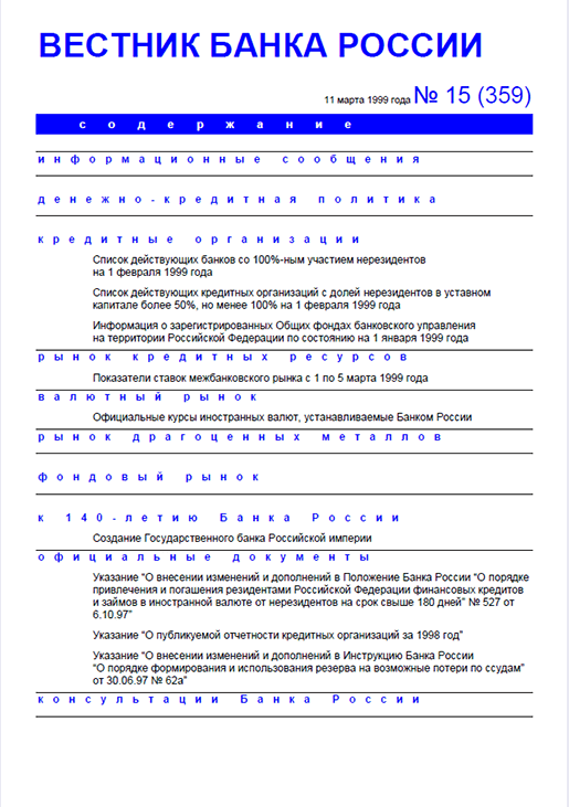 Вестник Банка России / Центральный банк Российской Федерации. — Москва : ПРАЙМ , 1999, N 15. — Москва : ИТАР-ТАСС, 1999.