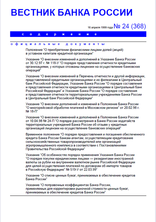Вестник Банка России / Центральный банк Российской Федерации. — Москва : ПРАЙМ , 1999, N 24. — Москва : ИТАР-ТАСС, 1999.