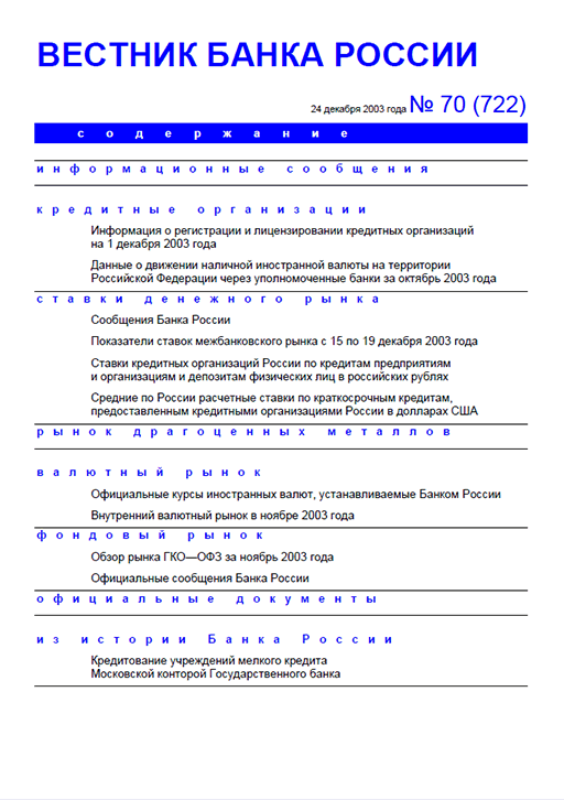 Вестник Банка России / Центральный банк Российской Федерации. — Москва : ПРАЙМ , 2003, N 70. — Москва : ПРАЙМ-ТАСС, 2003.