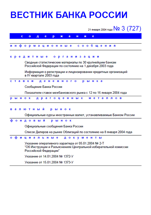 Вестник Банка России / Центральный банк Российской Федерации. — Москва : ПРАЙМ , 2004, N 3. — Москва : ПРАЙМ-ТАСС, 2004.