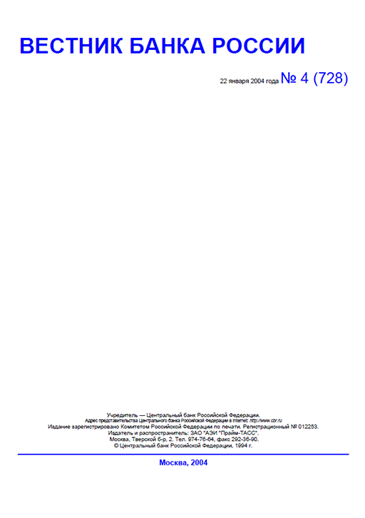 Вестник Банка России / Центральный банк Российской Федерации. — Москва : ПРАЙМ , 2004, N 4. — Москва : ПРАЙМ-ТАСС, 2004.