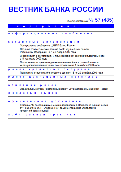 Вестник Банка России / Центральный банк Российской Федерации. — Москва : ПРАЙМ , 2000, N 57. — Москва : ИТАР-ТАСС, 2000.