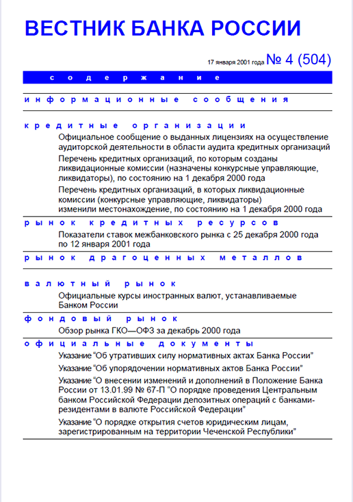 Вестник Банка России / Центральный банк Российской Федерации. — Москва : ПРАЙМ , 2001, N 4. — Москва : ПРАЙМ-ТАСС, 2001.