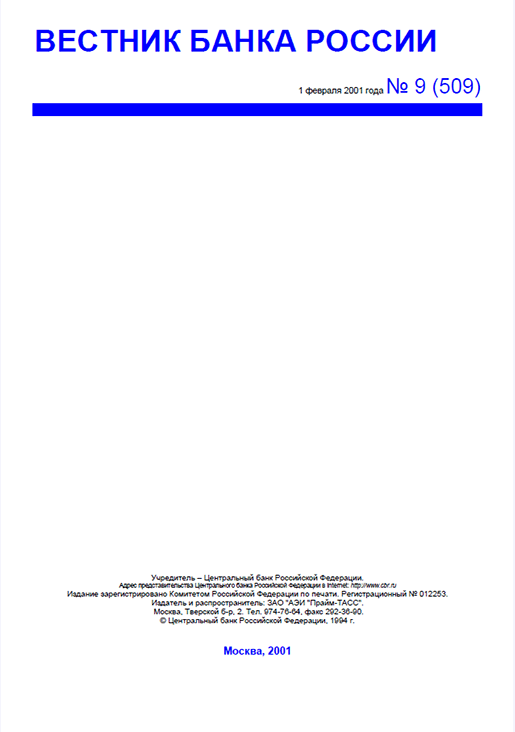 Вестник Банка России / Центральный банк Российской Федерации. — Москва : ПРАЙМ , 2001, N 9. — Москва : ПРАЙМ-ТАСС, 2001.