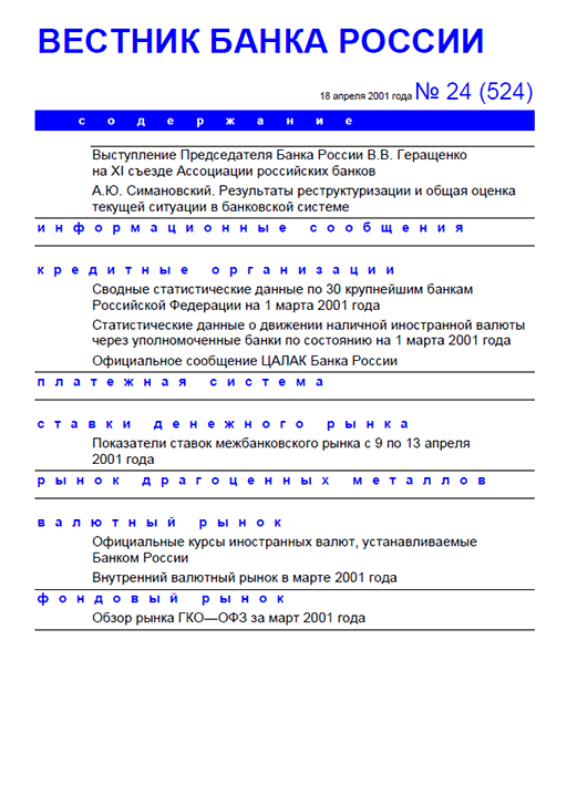 Вестник Банка России / Центральный банк Российской Федерации. — Москва : ПРАЙМ , 2001, N 24. — Москва : ПРАЙМ-ТАСС, 2001.