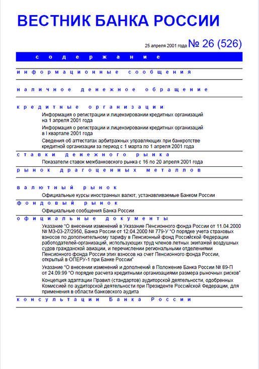 Вестник Банка России / Центральный банк Российской Федерации. — Москва : ПРАЙМ , 2001, N 26. — Москва : ПРАЙМ-ТАСС, 2001.